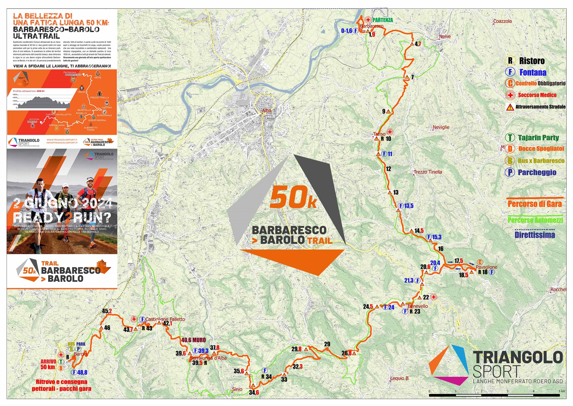 Lunghezza Km. 50 per AGONISTI Sui territori comunali di Barbaresco, Neive, Treiso, Trezzo Tinella, Castino, Borgomale, Benevello, Lequio Berria, Rodello, Albaretto Torre, Sinio, Serralunga d’Alba, Castiglion Falletto e Barolo.